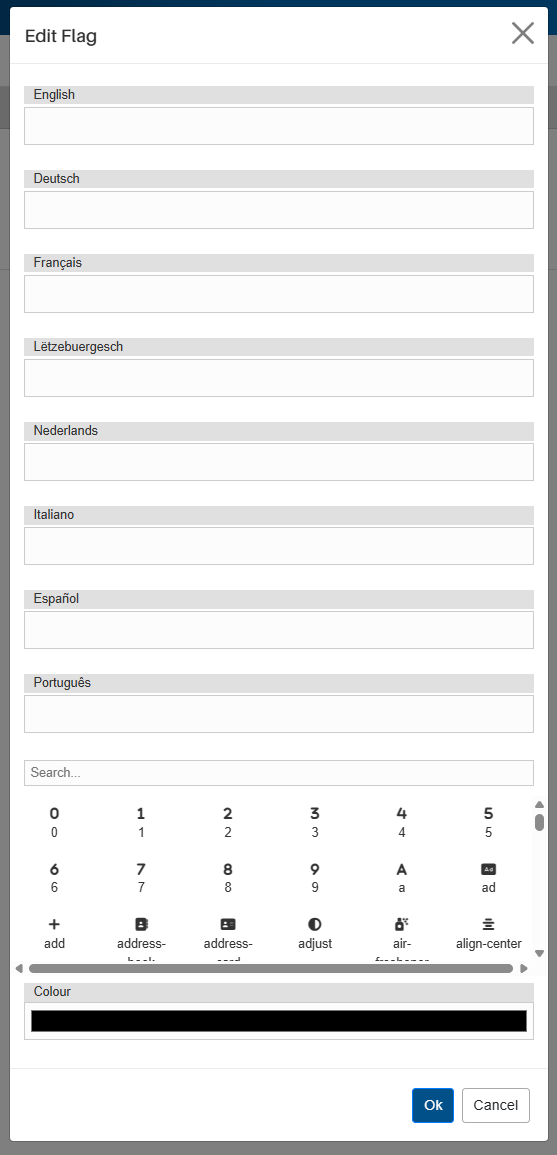You will now need to insert the name of the new flag in all the corresponding languages as well as defining a corresponding icon with the respective color.