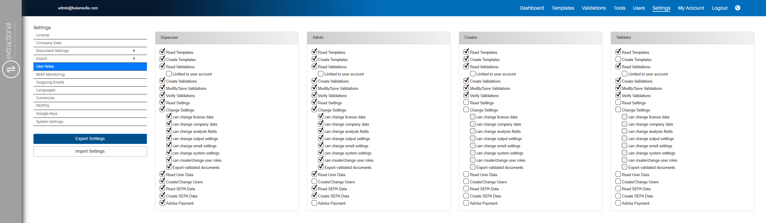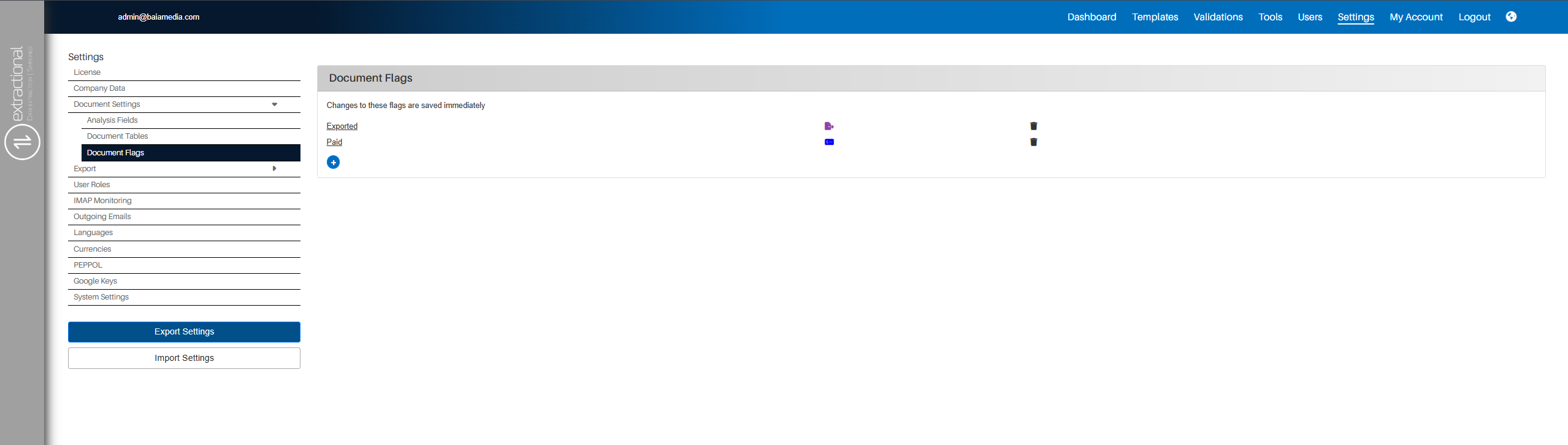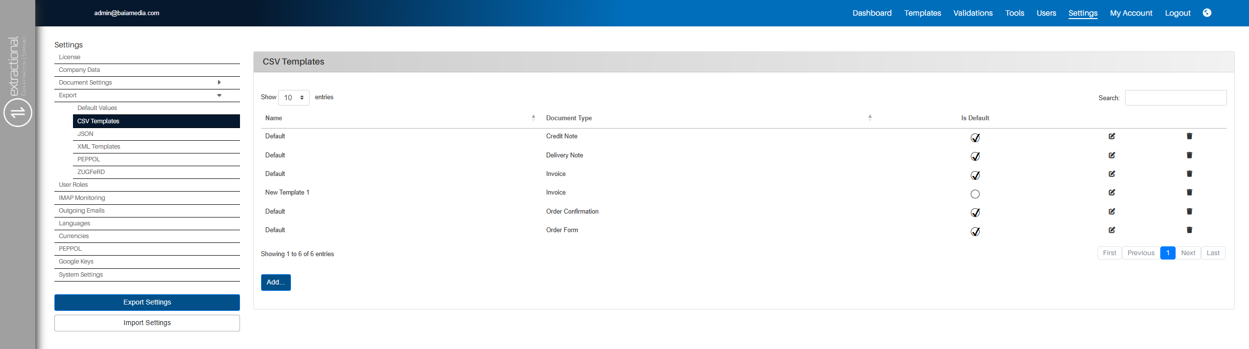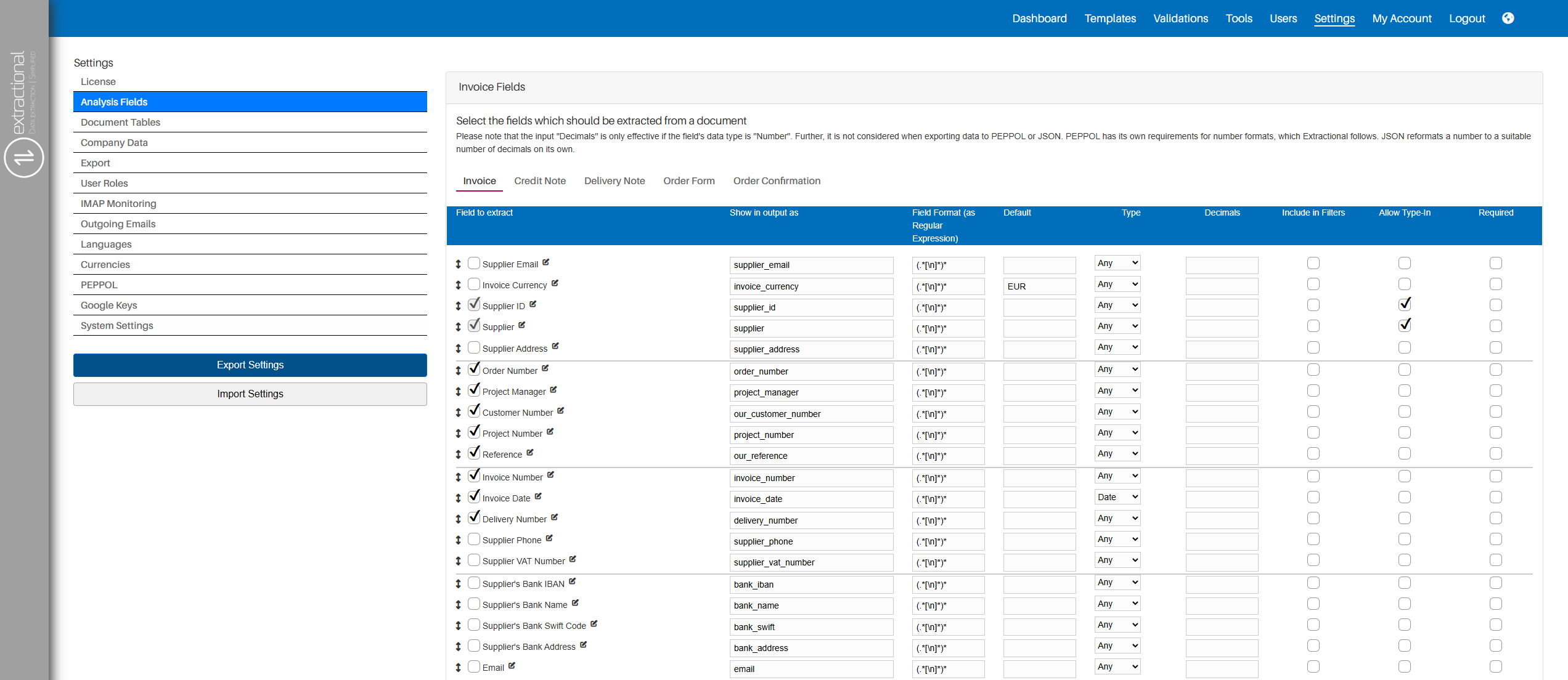 In this subpage of Settings, you can define all the data that shall be extracted from each type of document that is being read.