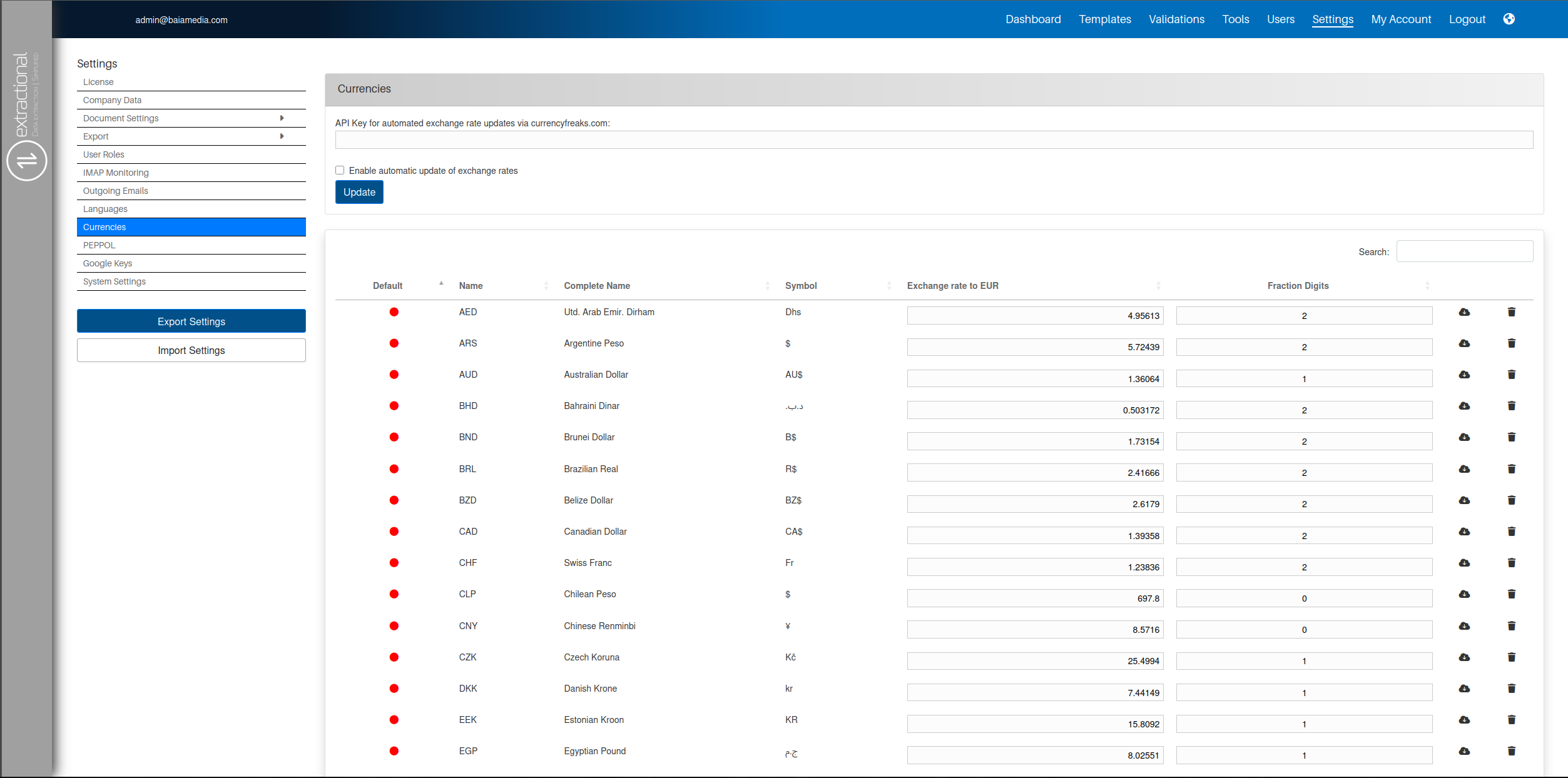 In this page you will be able to define all the conversion rates through in your system, this allowing the system to correctly converting the different currencies in the system.