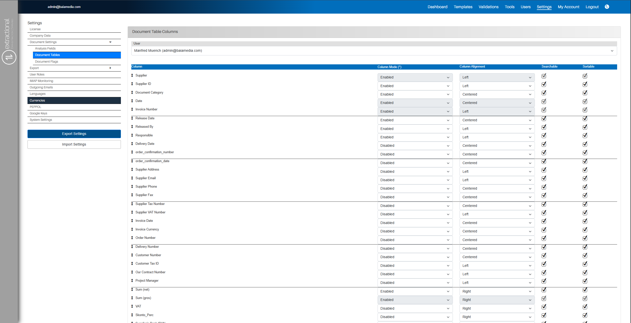 In this subpage of the settings you will be able to define what you would like to have visible in the document table the is situated in the Validations page.