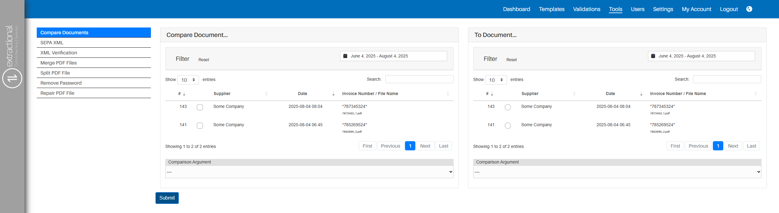 Once you have made your choice, you will simply need to click on the Submit button at the system will execute the comparison.