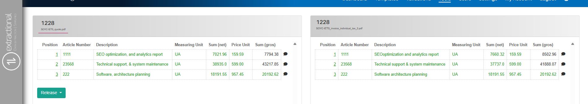 Additionally, you also have the possibility to directly change the state o of teh document that is being compared. This can be done by clicking on the Release button on the bottom left corner of the respective table.