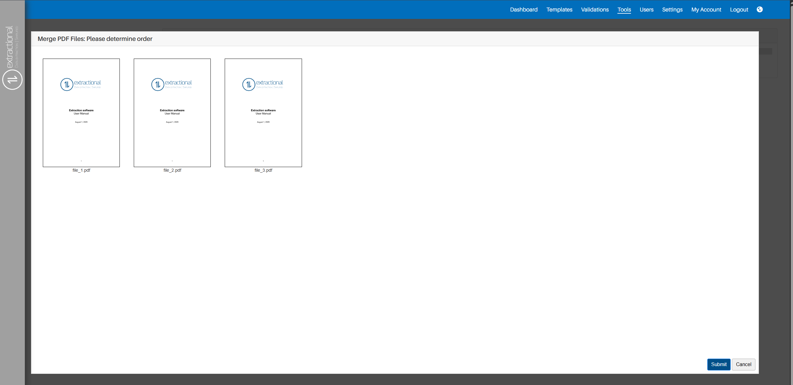 The system will then redirect you a new page where you will have the possibility to reorder all the files that you are going to merge. In order to reorder them you will need to drag them around. This reordering page shall look like this: