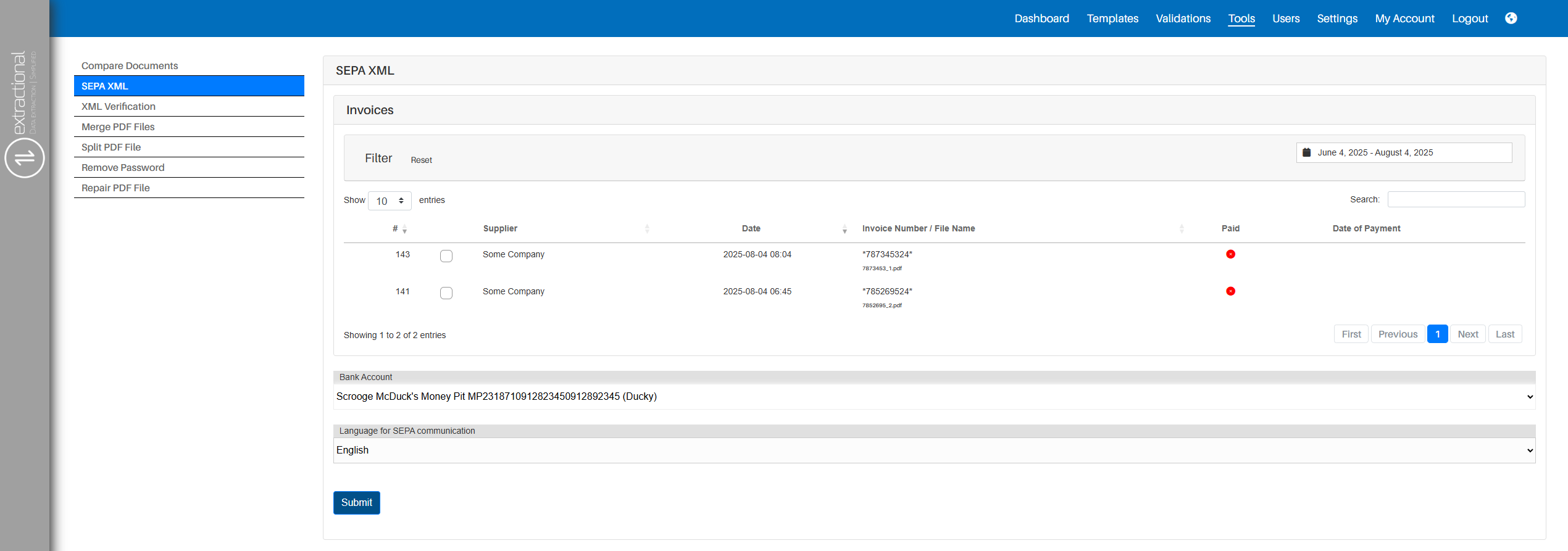 This tool will automatically generate all xml files containing all SEPA transactions needed to liquidate all selected validations.