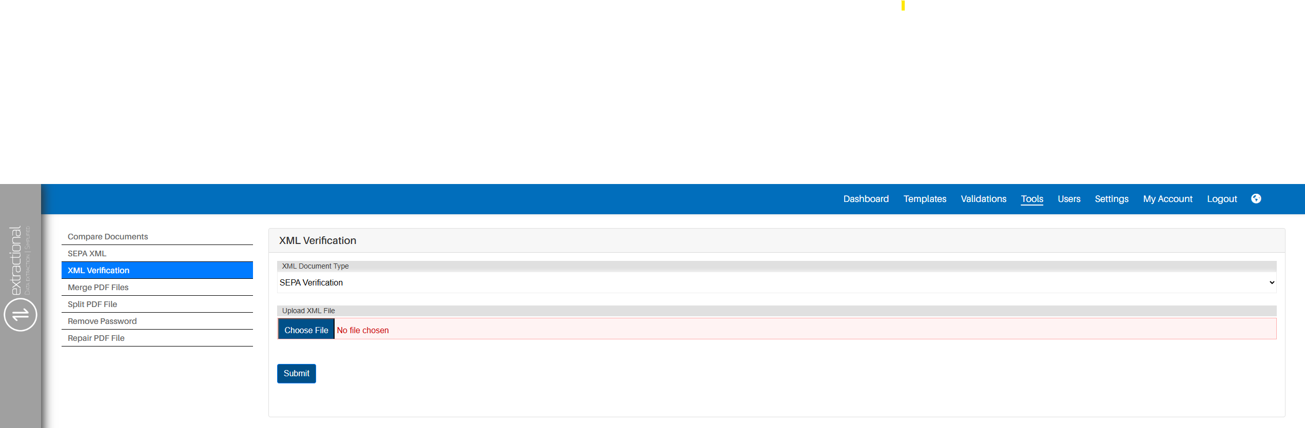 To use this tool, you will to need to start by clicking on the \"XML Verification\" text field on the left side of the screen. Once you have clicked on the respective button, you shall be presented with the following page: