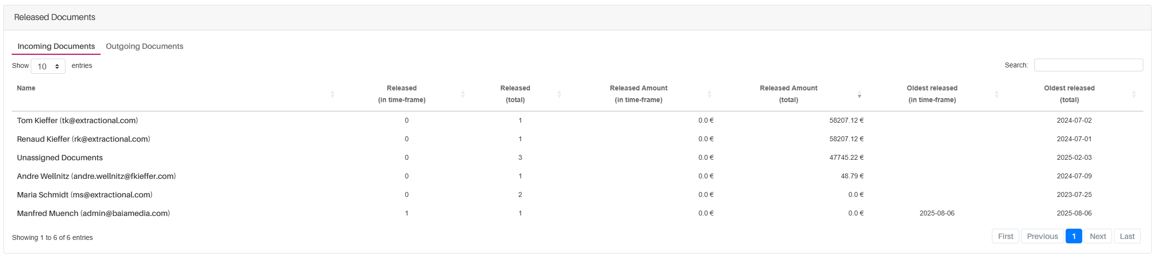 To switch between Incoming and Outgoing documents, use the tabs at the top of the table.
