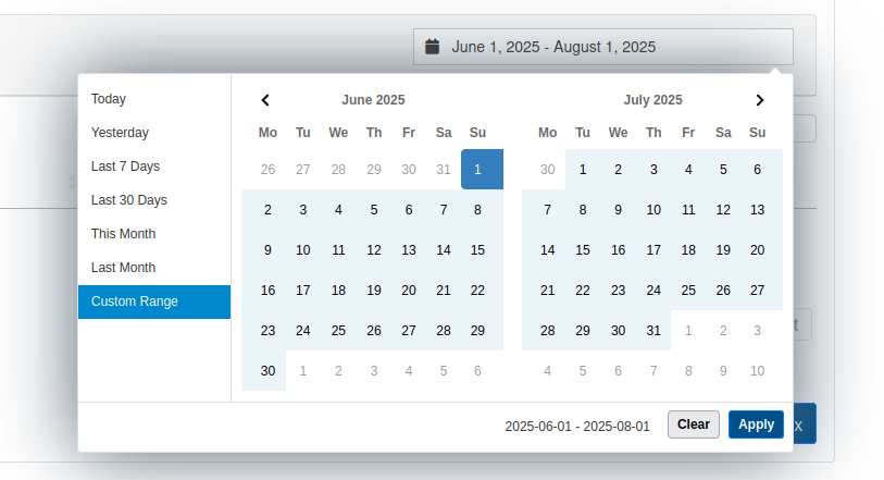 This time period can be defined by simply clicking the date icon on the top right corner of the system, and you will be shown the following window to change the dates: