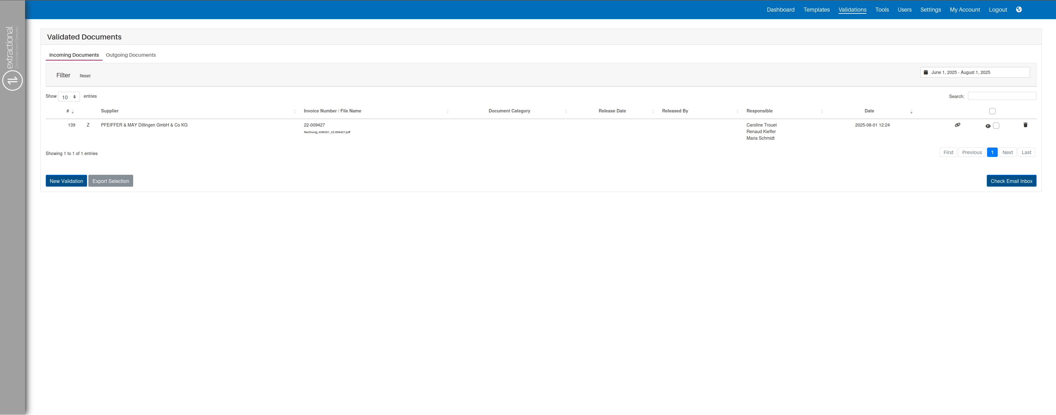 In this page, you can see all the different documents that have entered that system and that need validation from an individual before being accepted into the system. All documents that have been validated are also seen and reviewed on this page.